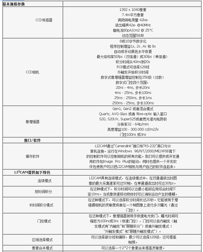LI2CAM是一种数字式微光摄相机,它专门用于工业和科技领域。它灵敏度很高,在1392?1040的分辨率下,可达单光子水平,全帧频速度可达每秒15帧。它有许多特色,例如可变积分时间,部分扫描模式(ROI), 像素合并,可达3秒的快速门控和外部触发等。LI2CAM通过光纤束把像增强器(二代或三代)耦合到CCD传感器以达到在高速和微光工作时的性能。LI2CAM可以配有不同类型的像增强器。这需要根据具体的应用来选择光谱灵敏度, 分辨率, 增益, 线形性, 选通时间和其他特殊要求。LI2CAM通过USB2.0接口与计算机连接, 并且完全由随机提供的软件来控制。USB2.0接口省掉了图像采集卡。同时也提供一个详细的软件开发包用于和用户的软件集成。